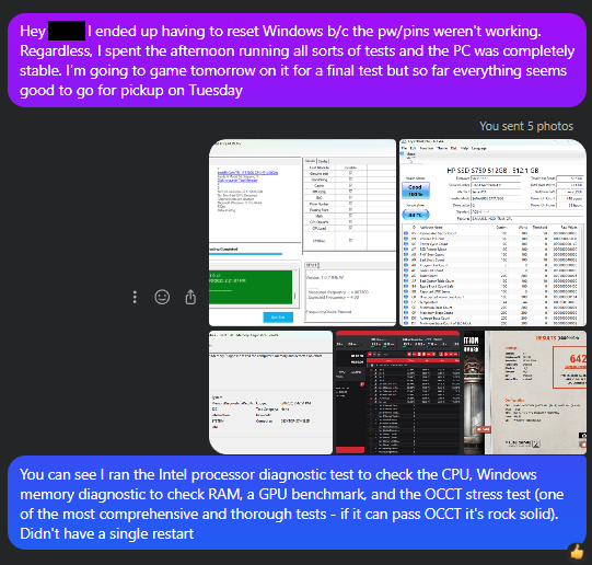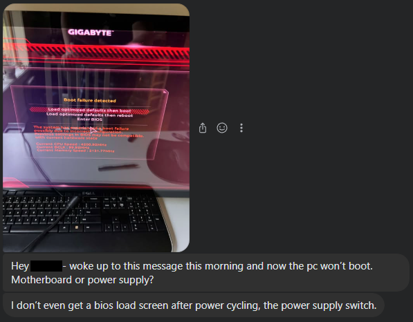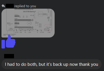 This was the same BIOS reset that occurred during the demo. I was able to walk the buyer through shorting the CMOS pins and reseating the RAM over Facebook Messenger and he was up running again:
