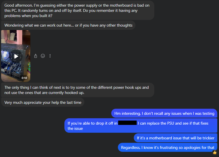 The ordeal wasn’t over yet! After another 2 weeks, I got another message, this time saying the PC randomly turns on and off and that now he wasn’t able to get it to boot: