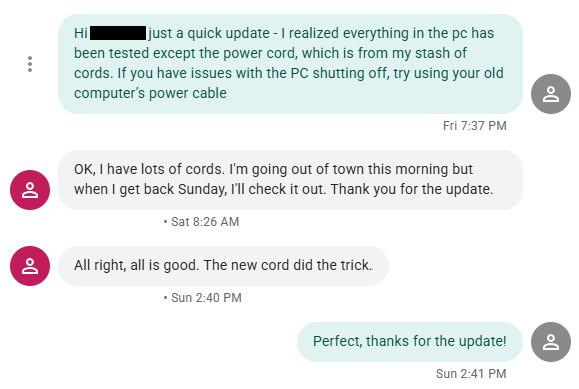 I texted the buyer afterwards letting him know that he should sub in his old computer’s power cable if he experienced any issues. So far I haven’t heard back and I’m assuming no news is good news 🤞.